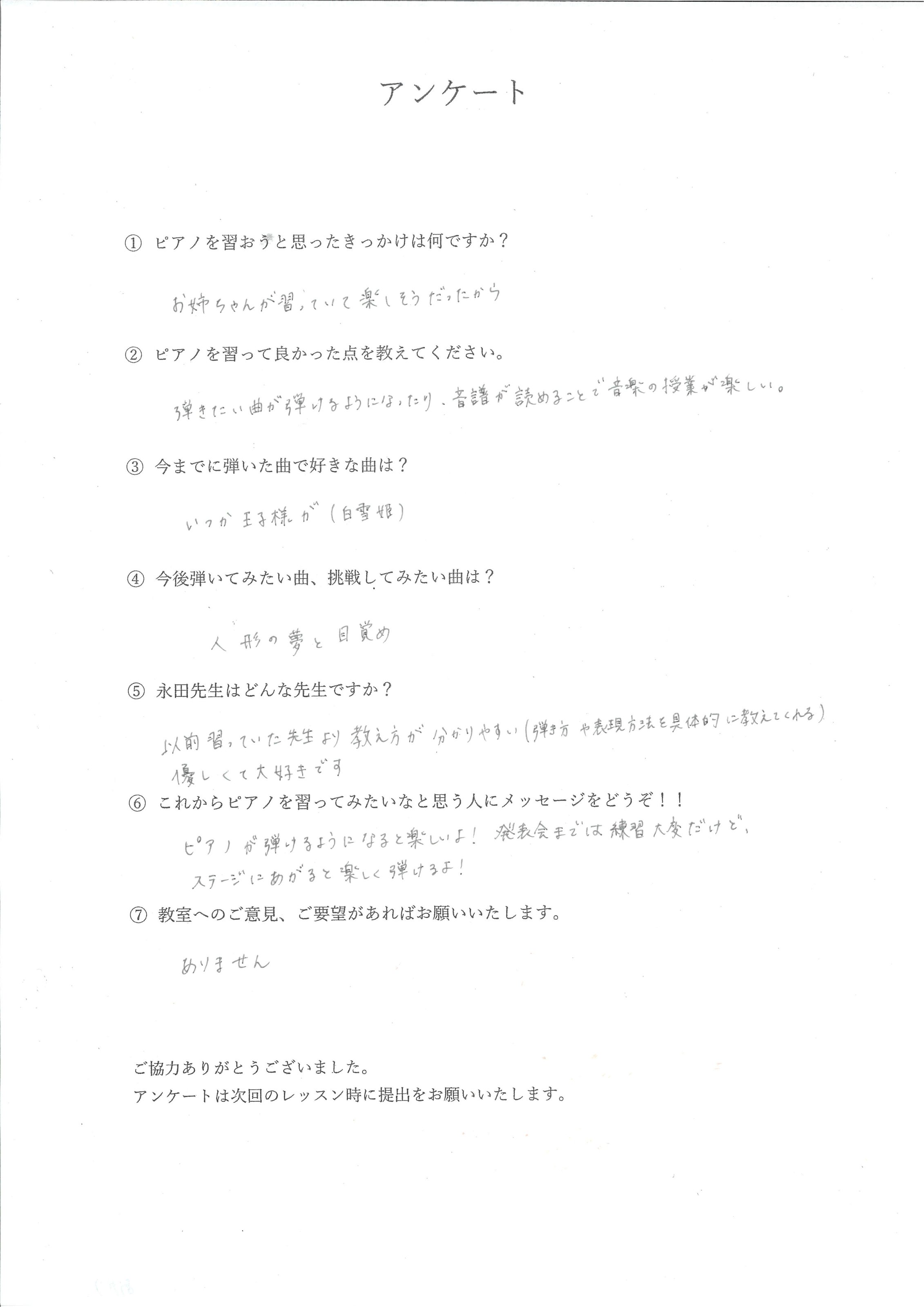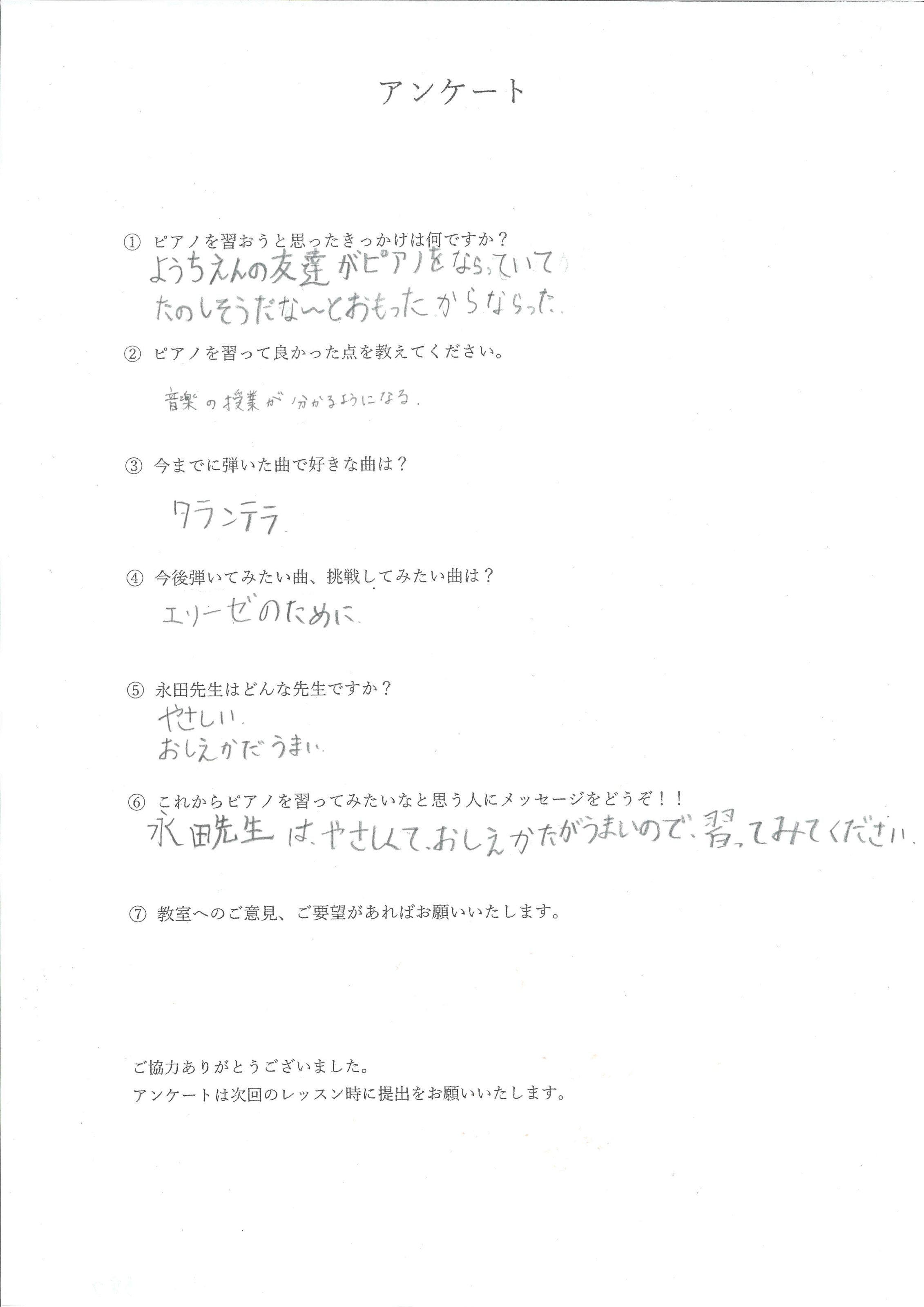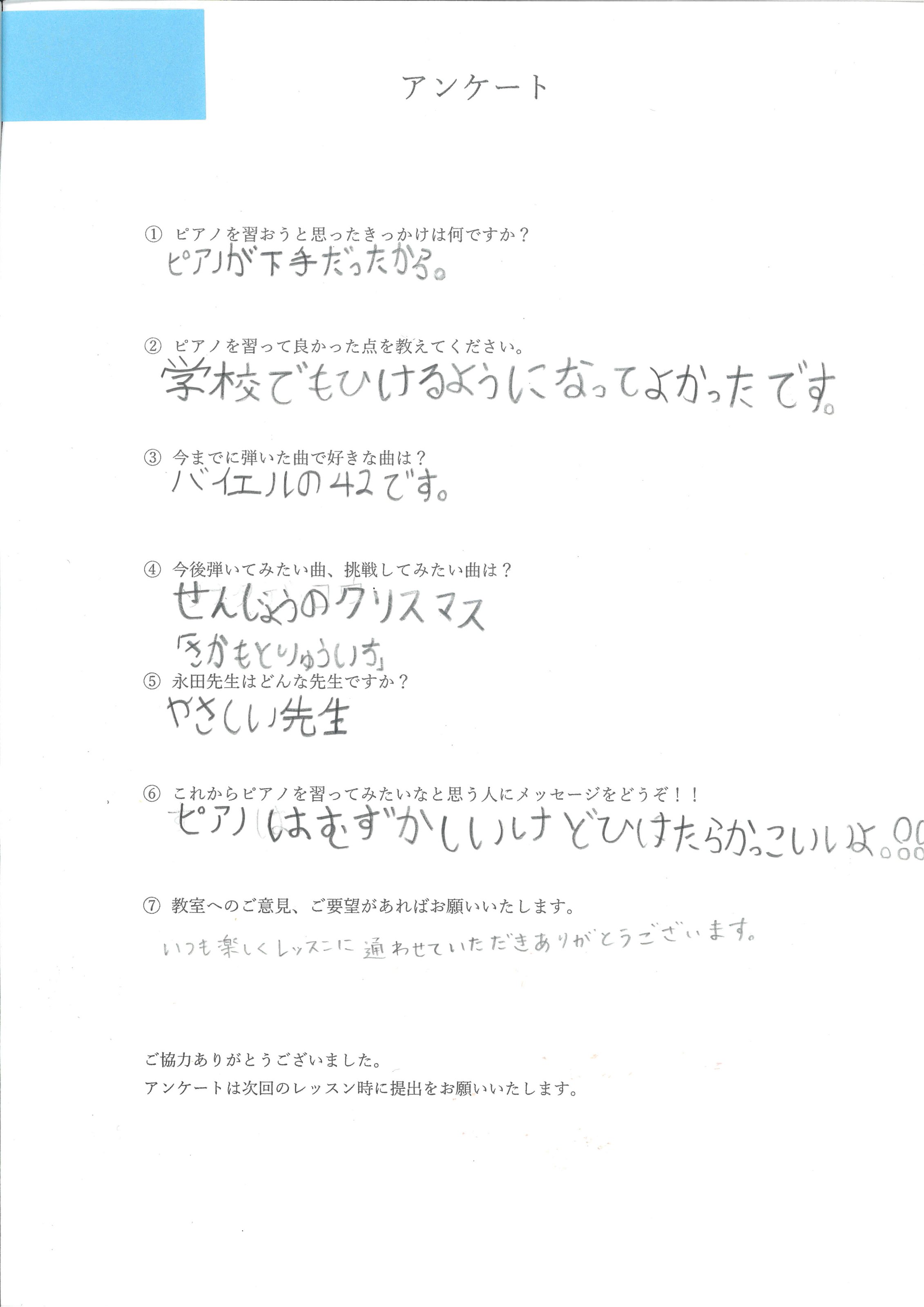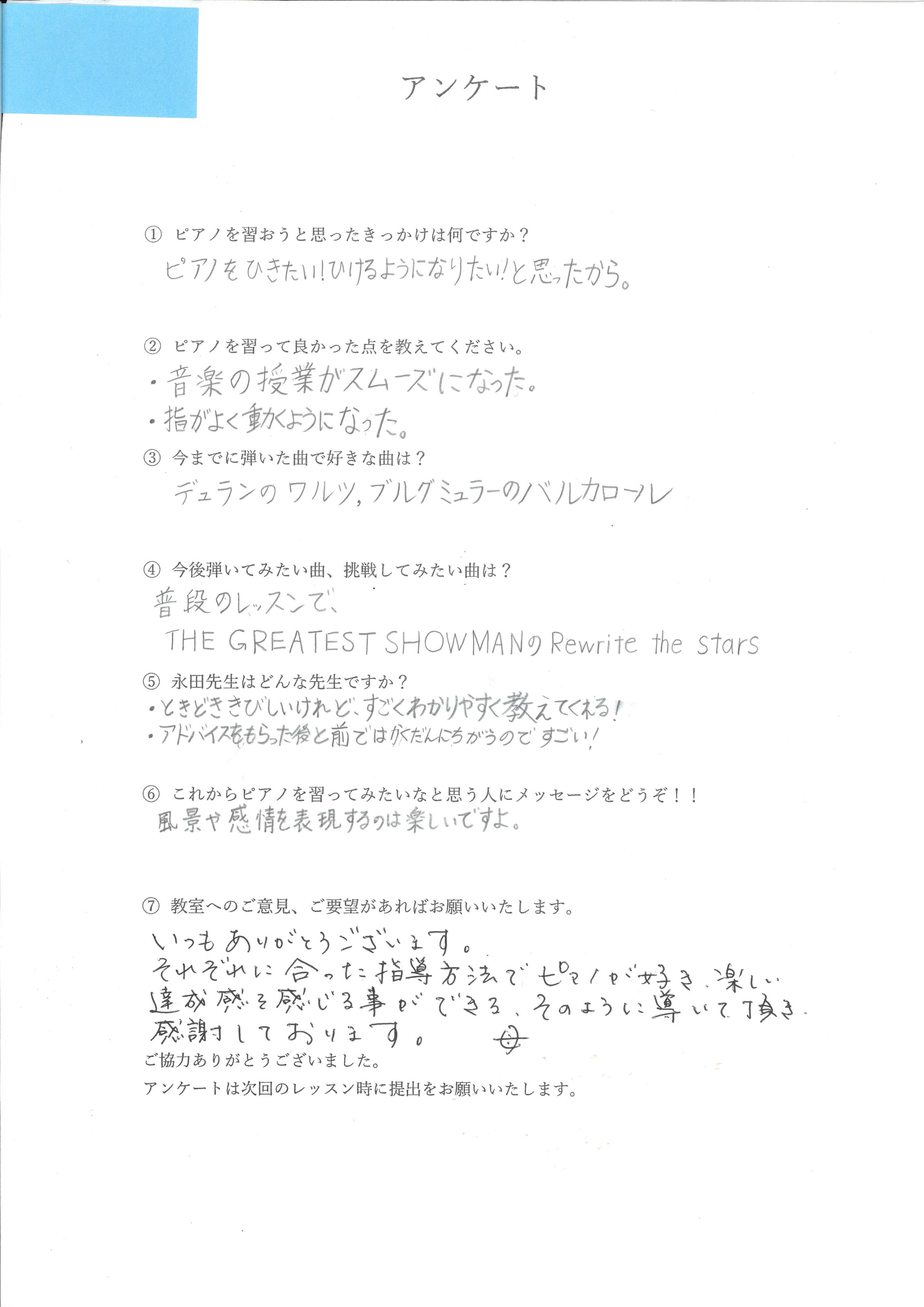 「以前習っていた先生より、弾き方や表現方法を具体的に教えてくれてわかりやすい!りょうこ先生は優しくて大好きな先生です」