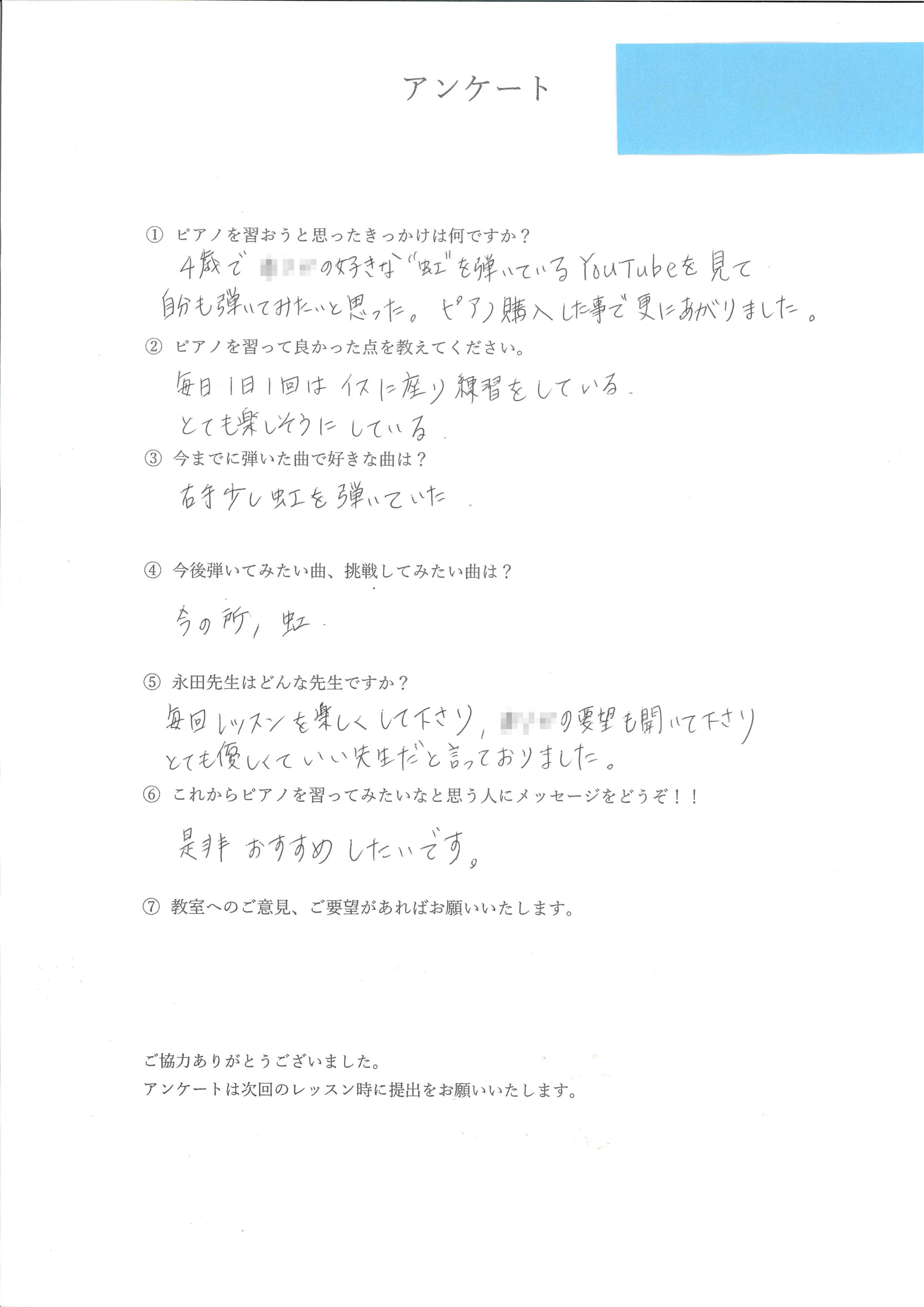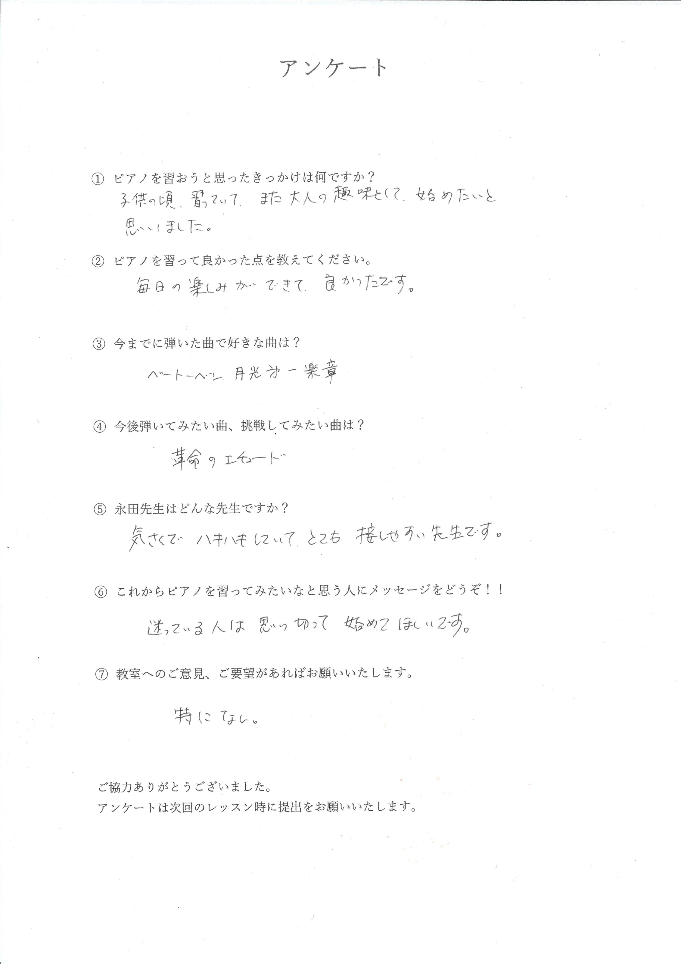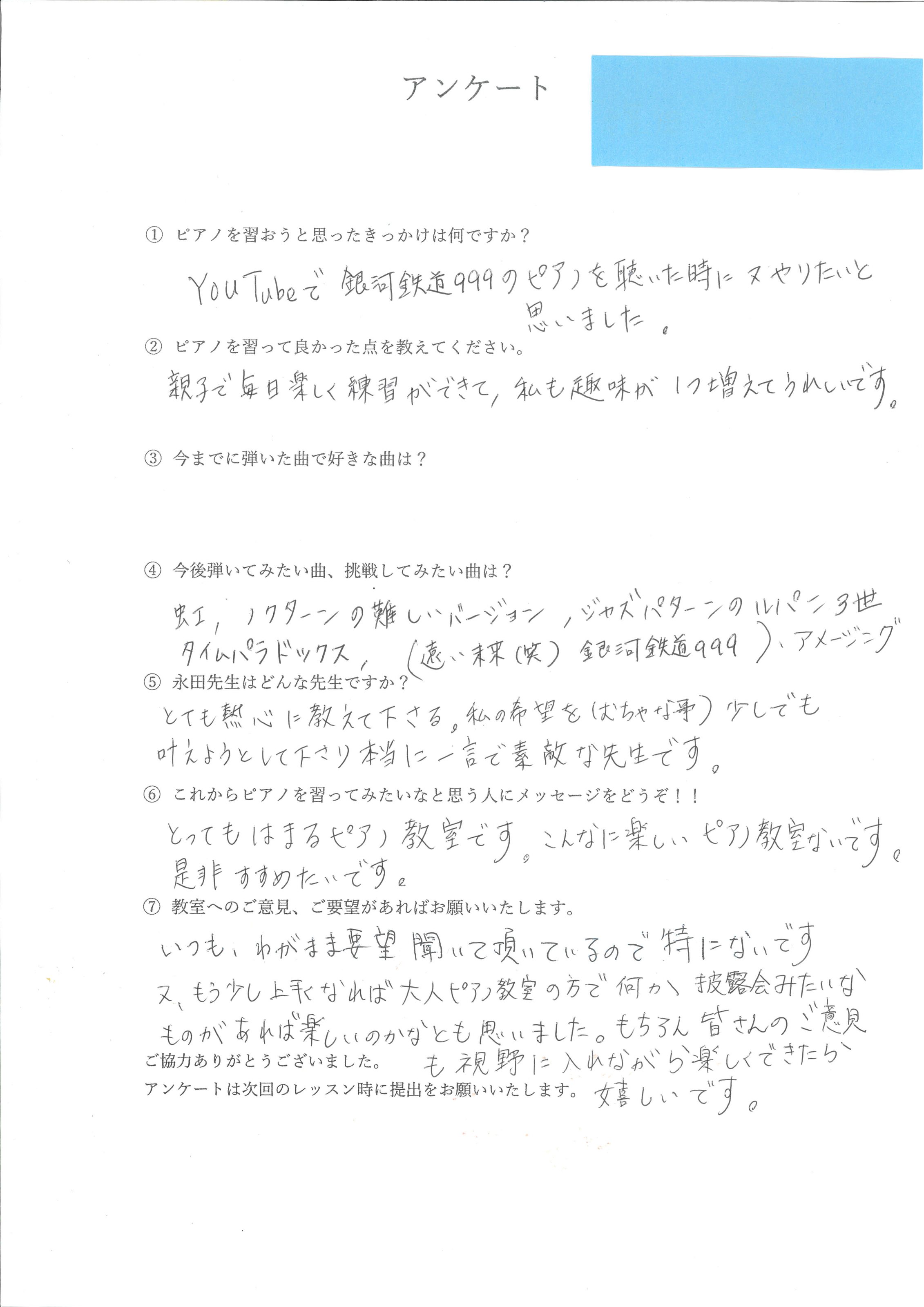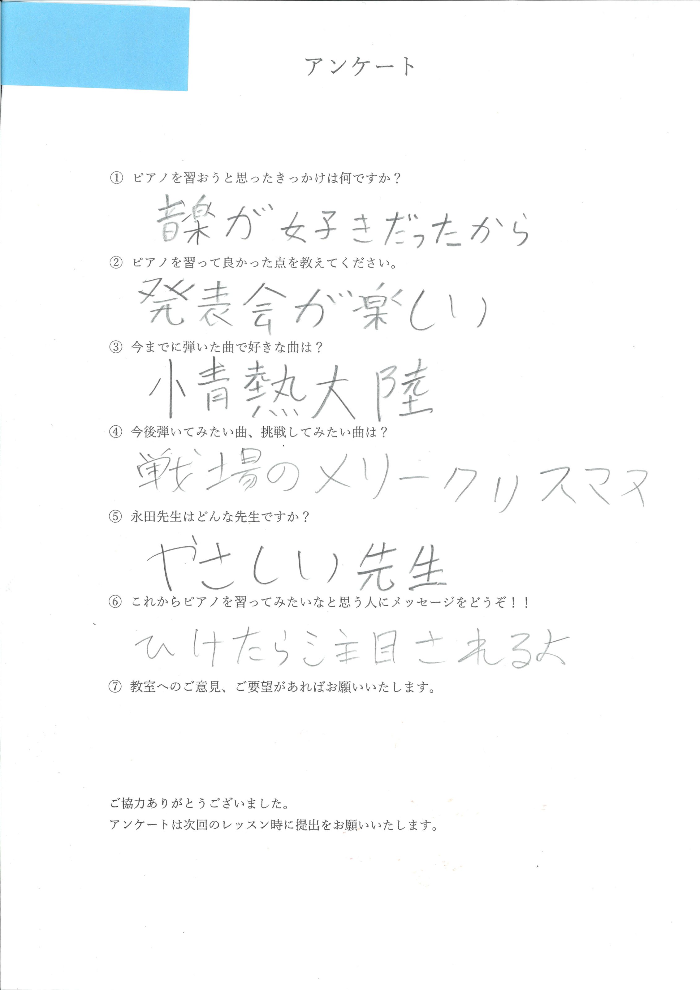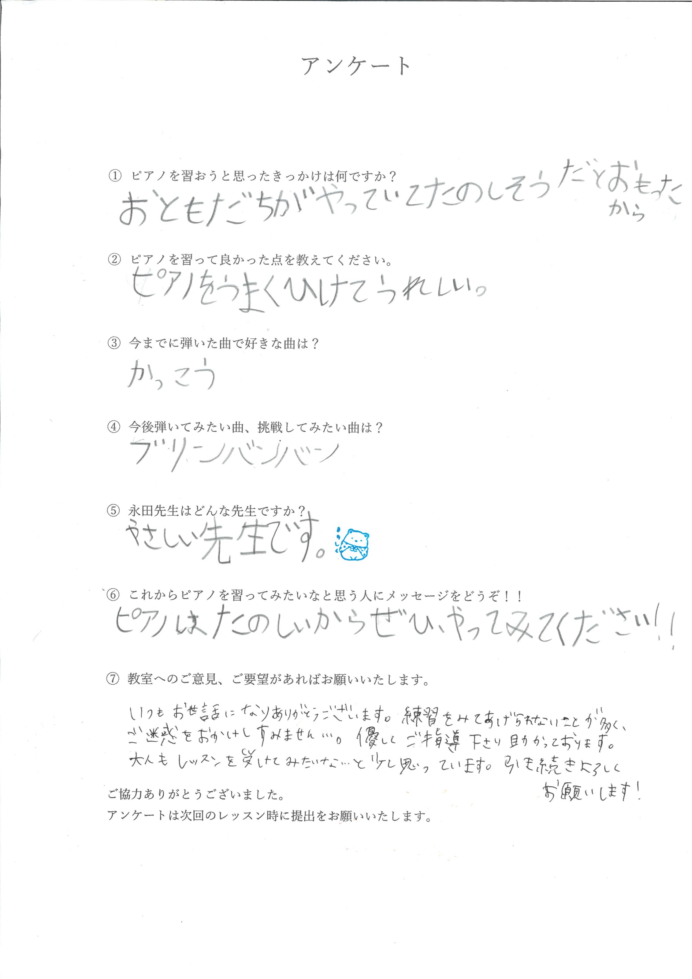 「以前習っていた先生より、弾き方や表現方法を具体的に教えてくれてわかりやすい!りょうこ先生は優しくて大好きな先生です」